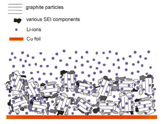 SEI 膜形成于電池的首次充放電過程中,鋰離子與溶劑(EC/DMC)、痕量水、HF等在石墨表面形成的一層鈍化膜,一層包含高分子與無機(jī)鹽的多空層。下面三張圖比較清晰的標(biāo)明了SEI所處的位置。(如圖3)