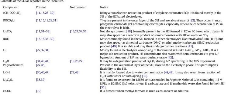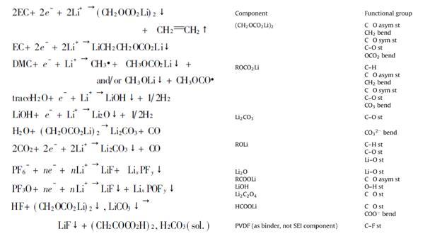 在形成過程中,發(fā)生了如下反應(yīng),生成了LiCO3、(CH2OCO2Li)2等無機(jī)/有機(jī)沉淀物、也生成了H2、C2H4等氣體分子。下表列出了一些常見組成成分。對于其中成分的分析,主要依靠FITR(紅外)和XPS(X射線光電子能譜分析),分別得到成分和結(jié)構(gòu)信息。