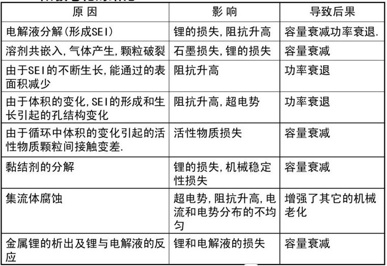 化成及老化工藝對于電池的壽命發(fā)揮至關(guān)重要。下表是J . Power Source列出的電池老化原理及性能影響。