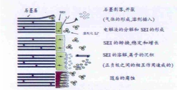 在膜的生長中,一個無效的SEI 層是困溶劑化鋰源,可以導(dǎo)致金屬鋰集群的增長。在不斷增長的SEI 中,被困的溶劑化鋰離子與電解液反應(yīng),增加表面積累的還原產(chǎn)物的濃度[9],顯著增加電荷轉(zhuǎn)移電阻[10]。在石墨表面積累的還原產(chǎn)物,降低了在SEI 層的孔隙大小,導(dǎo)致減緩了Li+ 的嵌入/ 脫嵌動力學(xué)。整個循環(huán)過程中,SEI膜是不斷變化的,大致如下圖: