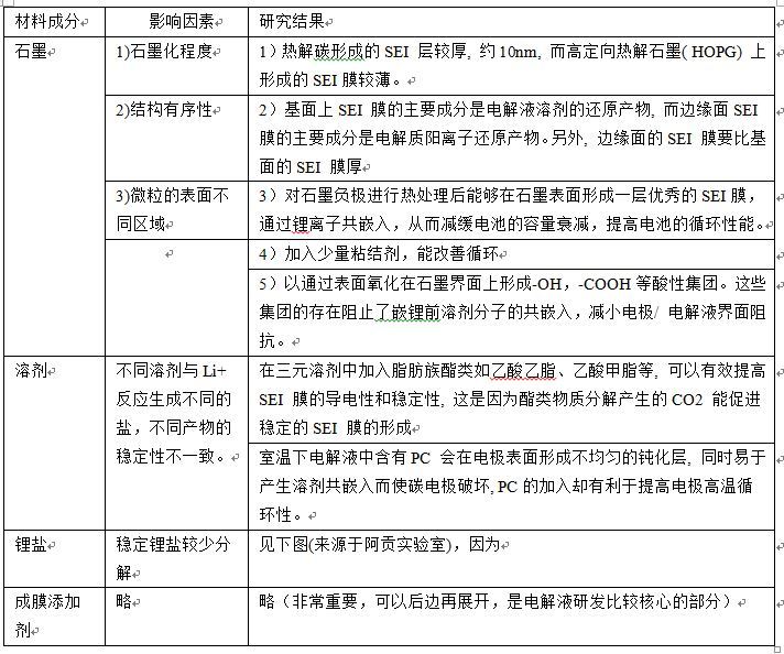 SEI膜的形成主要受到石墨、電解液(溶劑、鋰鹽)的影響,改善也是從這三個方面進(jìn)行.大致總結(jié)如下,如果是針對不同的石墨材料(人造石墨、MCMB、中間相微球)、電解液添加劑,展開較多,就不再展開。