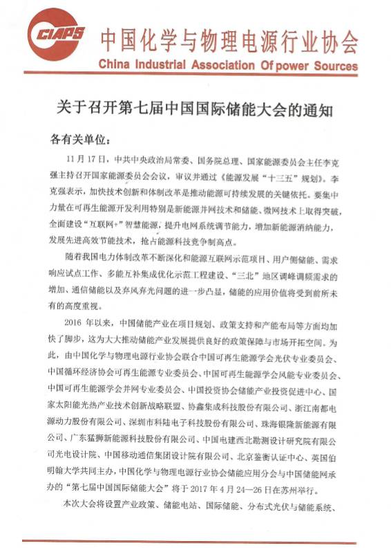 2016年以來(lái),中國(guó)儲(chǔ)能產(chǎn)業(yè)在項(xiàng)目規(guī)劃、政策支持和產(chǎn)能布局等方面均加快了腳步,這為大大推動(dòng)儲(chǔ)能產(chǎn)業(yè)發(fā)展提供良好的政策保障與市場(chǎng)開拓空間。為此,由中國(guó)化學(xué)與物理電源行業(yè)協(xié)會(huì)、中國(guó)可再生能源學(xué)會(huì)光伏專業(yè)委員會(huì)、中國(guó)循環(huán)經(jīng)濟(jì)協(xié)會(huì)可再生能源專業(yè)委員會(huì)、中國(guó)可再生能源學(xué)會(huì)風(fēng)能專業(yè)委員會(huì)、中國(guó)可再生能源學(xué)會(huì)并網(wǎng)專業(yè)委員會(huì)、中國(guó)投資協(xié)會(huì)儲(chǔ)能產(chǎn)業(yè)投資促進(jìn)中心、國(guó)家太陽(yáng)能光熱產(chǎn)業(yè)技術(shù)創(chuàng)新戰(zhàn)略聯(lián)盟、協(xié)鑫集成科技股份有限公司、浙江南都電源動(dòng)力股份有限公司、深圳市科陸電子科技股份有限公司、珠海銀隆新能源有限公司、廣東猛獅新能源科技股份有限公司、中國(guó)電建西北勘測(cè)設(shè)計(jì)研究院有限公司光電設(shè)計(jì)院、中國(guó)移動(dòng)通信集團(tuán)設(shè)計(jì)院有限公司、北京鑒衡認(rèn)證中心、英國(guó)伯明翰大學(xué)聯(lián)合主辦,中國(guó)化學(xué)與物理電源行業(yè)協(xié)會(huì)儲(chǔ)能應(yīng)用分會(huì)與中國(guó)儲(chǔ)能網(wǎng)承辦的“第七屆中國(guó)國(guó)際儲(chǔ)能大會(huì)”將于2017年4月24—26日在蘇州舉行。