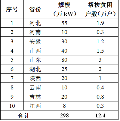 地面電站2.98GW,涉及10省,計(jì)劃幫扶12.4萬(wàn)貧困戶。