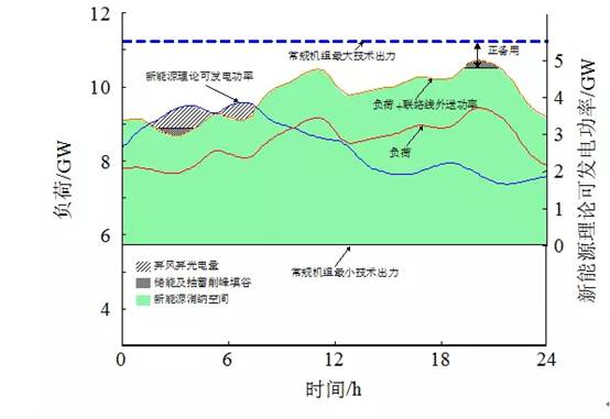 對(duì)于內(nèi)部無網(wǎng)絡(luò)約束的系統(tǒng),新能源消納只需滿足發(fā)、用電動(dòng)態(tài)平衡和系統(tǒng)調(diào)節(jié)能力下限約束,“負(fù)荷+聯(lián)絡(luò)線外送功率”曲線與系統(tǒng)調(diào)節(jié)能力下限之間的系統(tǒng)調(diào)節(jié)空間,即理論上的新能源最大消納空間。