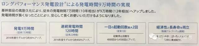技術(shù)指標(biāo)方面,除了90%的系統(tǒng)效率之外,松下的2017年4月開始發(fā)售的新款產(chǎn)品的指標(biāo)也有提高,尤其是使用壽命長達(dá)9萬小時(shí)、啟停次數(shù)高達(dá)4500次,可以用到12年,相當(dāng)有吸引力。