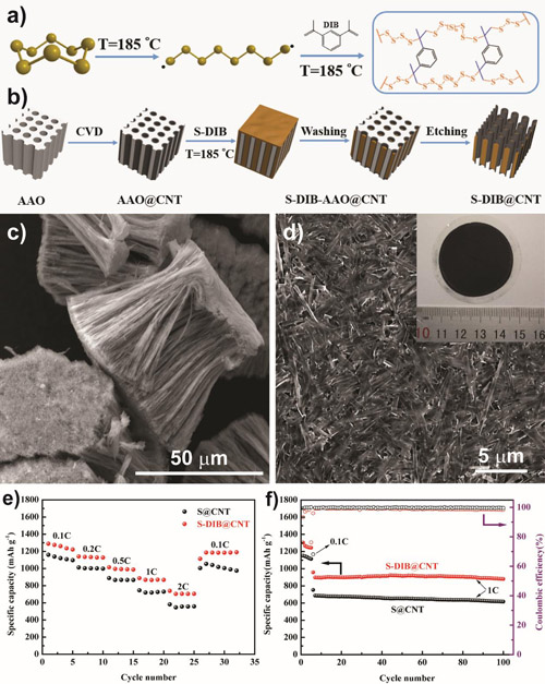 圖1 有機(jī)硫聚合物(a) 和有機(jī)硫聚合物/碳納米管復(fù)合材料(b)的合成示意圖;有機(jī)硫聚合物/碳納米管復(fù)合材料(c)和膜電極(d)的掃描電鏡照片;物理和化學(xué)雙重限制的有機(jī)硫聚合物/碳納米管與單一物理限制的硫/碳納米管復(fù)合材料的倍率性能 (e)和循環(huán)性能(f)對(duì)比。