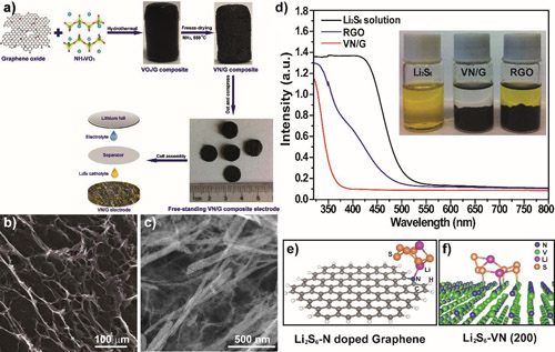 圖2 (a)氮化釩/石墨烯復(fù)合材料的制備及鋰硫電池組裝示意圖;氮化釩/石墨烯復(fù)合材料的掃描電鏡照片(b)和掃描透射電鏡照片(c);(d)氮化釩/石墨烯復(fù)合材料對(duì)多硫化物的吸附性能;氮摻雜石墨烯(e)與氮化釩(f)與多硫化物相互作用的理論計(jì)算模型。