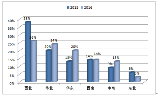2016年,我國(guó)六大區(qū)域的風(fēng)電新增裝機(jī)容量所占比例分別為西北地區(qū)、華北、華東、西南、中南、東北。與2015年相比,2016年我國(guó)華北地區(qū)和華東地區(qū)以及中南地區(qū)占比均出現(xiàn)了增長(zhǎng),其中華東地區(qū)占比由13%增長(zhǎng)到20%,中南地區(qū)占比由9%增長(zhǎng)到13%;西北地區(qū)和東北地區(qū)均出現(xiàn)減少,其中西北地區(qū)占比由38%下降到26%;西南地區(qū)占比維持不變。