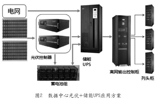 數(shù)據(jù)中心光伏+儲能UPS應(yīng)用方案如圖2所示,它是在現(xiàn)有的儲能UPS方案上增加了光伏,即在白天光照最好的時候,通過光伏控制器給蓄電池進行充電。