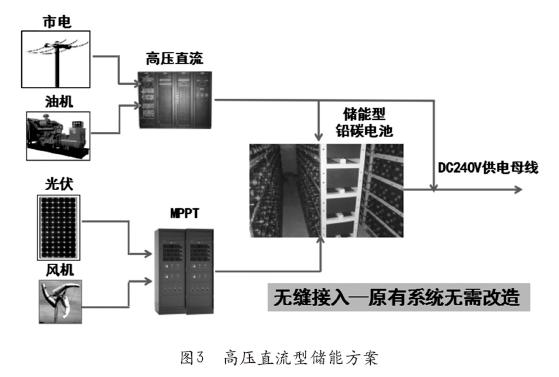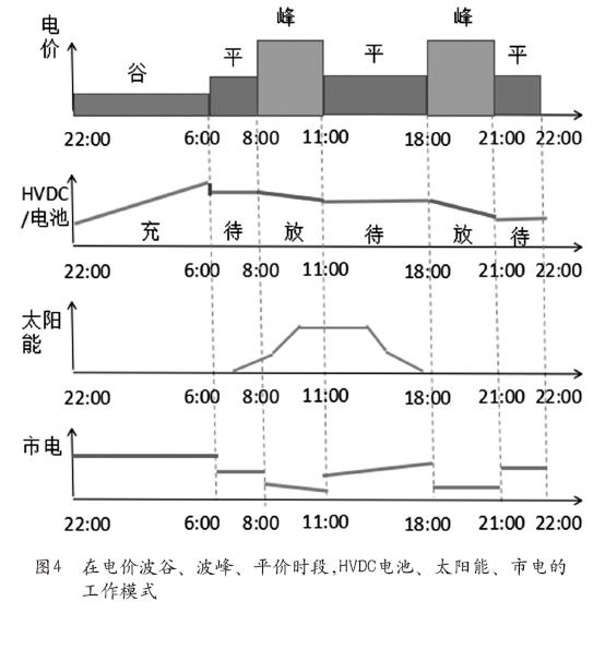 高壓直流型儲能方案如圖3所示,它打造了一個直流微網(wǎng)的方案,通過高壓直流給電池充電,同時給設(shè)備供電。這套方案可以將光伏、風(fēng)機無縫并到直流系統(tǒng)里面,組成儲能系統(tǒng),但是原有系統(tǒng)卻無需改造。在電價波谷、波峰、平價時段,HVDC/電池、太陽能、市電的工作模式如圖4所示。