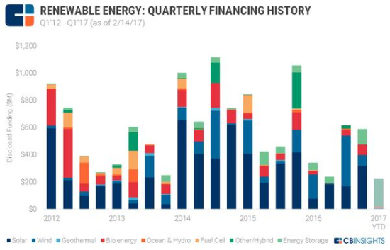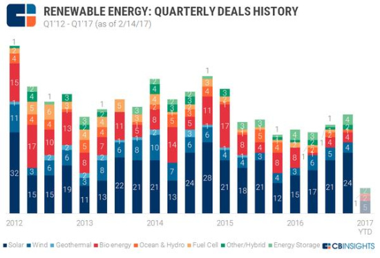 盡管如此,截至到2月14日,2017年可再生能源初創(chuàng)企業(yè)僅完成10宗投資,和2016年第四季度比有所下降。