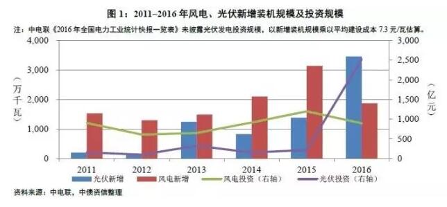 自“十二五”開始,國(guó)家加快發(fā)展可再生能源,尤其加大了風(fēng)電、光伏等資源豐富地區(qū)的可再生能源發(fā)電機(jī)組建設(shè)。《能源“十二五”發(fā)展規(guī)劃》預(yù)計(jì)2015年風(fēng)電、光伏發(fā)電累計(jì)裝機(jī)規(guī)模分別為1億千瓦及0.21億千瓦。但可再生能源補(bǔ)貼退坡的影響下,風(fēng)電與光伏發(fā)電出現(xiàn)了大規(guī)?!皳屟b潮”——2015年末實(shí)際規(guī)模分別為1.31億千瓦與0.42億千瓦,遠(yuǎn)超預(yù)期。這一勢(shì)頭在2016年得以保持。