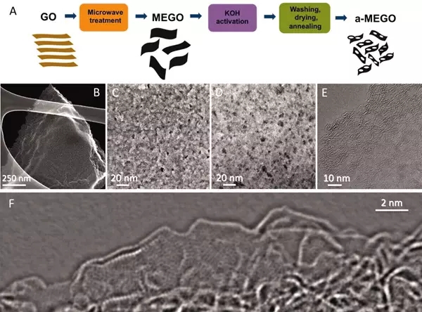 超級電容器在廣泛使用的過程中由于其低能量密度和相對較高的有效的串聯(lián)電阻而受到限制,使用電化學(xué)活化方法來剝離石墨烯,研究者們合成了一種比表面積高達(dá)3100m2/g的多孔碳,這種材料具有高的導(dǎo)電率和低的氧氫含量,靠sp2鍵結(jié)合的碳具有連續(xù)且高度彎曲的三維網(wǎng)狀結(jié)構(gòu),原子層墻最初的形成厚度為0.6-5納米寬度的孔隙,使用這種碳材料組裝的兩電極超級電容器有著高的質(zhì)量電容和高能量密度,而且文章中的方法甚至可以發(fā)展到產(chǎn)業(yè)化中。