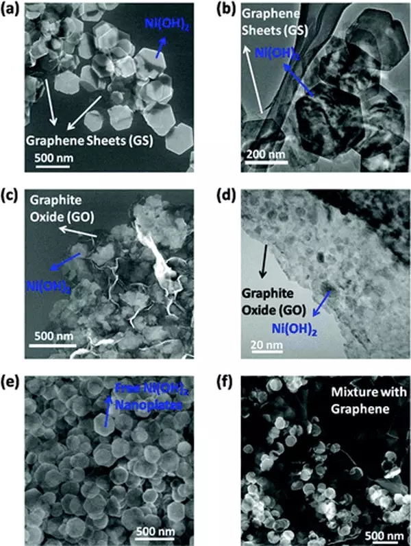 Ni(OH)2納米晶體上生長不同氧化程度的石墨烯片層作為電化學(xué)贗電容材料是一種十分有潛力的儲能應(yīng)用材料。單晶Ni(OH)2六邊形納米片直接生長在輕度氧化、表面導(dǎo)電的石墨烯片層上,復(fù)合材料顯示出高的比電容約為1335F/g和優(yōu)異的循環(huán)性能。高的比電容和快速的充放電能力很有前途應(yīng)用于能量密度和功率密度超高的超級電容器。預(yù)制備Ni(OH)2六邊形納米片和石墨烯進(jìn)行一個簡單的物理混合顯示出較低的比電容,凸顯出直接在石墨烯納米材料的重要性,賦予了活性納米材料和導(dǎo)電石墨烯網(wǎng)絡(luò)之間緊密的相互作用和有效電荷傳輸。單晶Ni(OH)2六邊形納米片直接生長在石墨烯片層上的性能要優(yōu)于在小的Ni(OH)2納米顆粒上生長高度氧化的、電絕緣的網(wǎng)狀石墨烯。