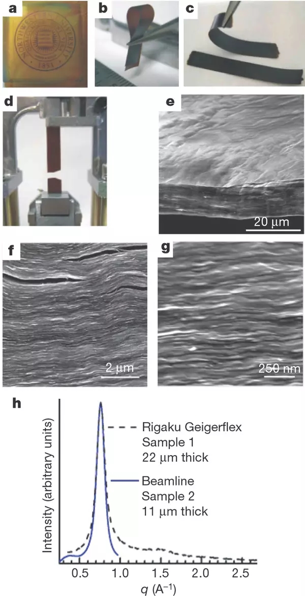 自支撐的紙型和薄膜型材料已經(jīng)是當(dāng)今社會技術(shù)中的一部分,它們可以應(yīng)用在保護(hù)圈、化學(xué)濾器、電池和超級電容器的組分、粘結(jié)層以及分子存儲等方面,納米級的無機紙型材料(比如剝離的蛭石和云母板)已經(jīng)受到很多關(guān)注,而且已經(jīng)作為保護(hù)涂料、高溫粘結(jié)劑、介質(zhì)阻擋和氣體防滲膜等材料商業(yè)化。來源于巴奇紙的碳納米管顯示出優(yōu)異的機械和電子性能,使它可能應(yīng)用于燃料電池和結(jié)構(gòu)復(fù)合物。文章報道了一種氧化石墨烯紙的制備和表征,這種氧化石墨烯紙是單個氧化石墨烯片層定流控制制備的碳基膜材料。這種新型材料在剛度和強度上超過其他很多紙型材料,這種材料結(jié)合了宏觀上剛性和柔性兩種優(yōu)點,紙型的片層之間有很大的表面相互作用力,其褶皺也處于原子級別,褶皺形態(tài)處于亞微米級別,這些條件使材料的宏觀樣品具有高效的載荷分布,也使材料相比于傳統(tǒng)的碳基、黏土基紙更有彈性。類似于氧化石墨烯的廉價原始材料促進(jìn)了大面積紙型片層的制備,同時可以應(yīng)用于可控滲透過濾膜、各向異性離子導(dǎo)體、超級電容器、分子儲存材料等。石墨烯氧化紙也可以摻雜或作為物質(zhì)載體制備含有聚合物、陶瓷和金屬的混合材料。另外,分層的氧化石墨烯片層表面有許多化學(xué)官能團(tuán)使材料具有更多功能。