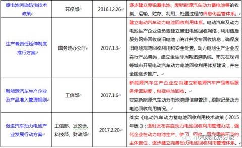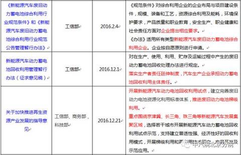 中國(guó)儲(chǔ)能網(wǎng)訊:近年來(lái),在國(guó)家政策的引導(dǎo)和推動(dòng)下,我國(guó)新能源汽車(chē)產(chǎn)業(yè)發(fā)展迅速,隨著新能源汽車(chē)逐漸進(jìn)入報(bào)廢期,車(chē)用動(dòng)力電池的回收利用問(wèn)題也會(huì)越來(lái)越突出。政府高度重視動(dòng)力電池回收利用的工作,已經(jīng)出臺(tái)多項(xiàng)相關(guān)政策來(lái)推動(dòng)動(dòng)力電池回收利用產(chǎn)業(yè)的發(fā)展(見(jiàn)表1)。