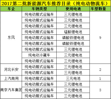2017年3月1日發(fā)布的第二批新能源汽車推薦目錄中,共有13家企業(yè)29款純電動(dòng)物流車,其中25款車型選用三元鋰電池,3款車型選用磷酸鐵鋰電池,1款選用錳酸鋰電池,如下表所示: