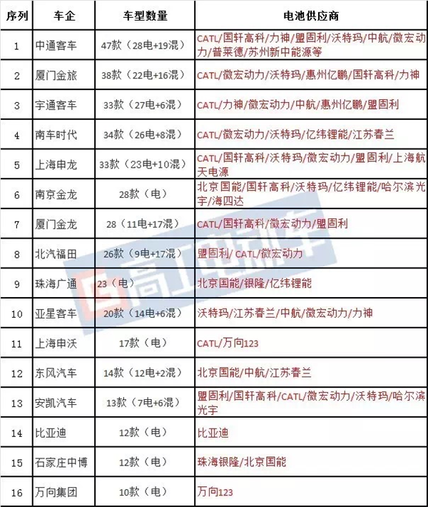 另外還有16款鈦酸鋰電池純電動(dòng)客車,其中珠海廣通汽車8款,石家莊中博汽車7款,成都客車1款。