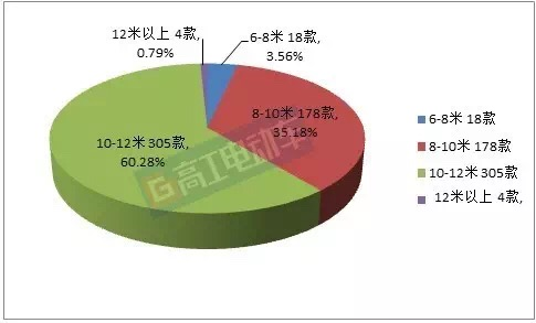 本批公告中,6-8米客車車型數(shù)量為18款,占比達(dá)到3.56%;8-10米車型共計(jì)178款,占比達(dá)到35.18%;10-12米的車型數(shù)量高達(dá)305款,占比達(dá)到60.28%;12米以上的車型有4款,其中有2款車長(zhǎng)達(dá)到18米左右。分別由珠海廣通與浙江南車電車推出。