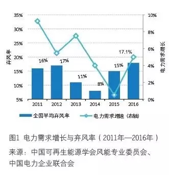 (1)2015 年,我國風電占總發(fā)電量的3.3%。2016 年,總體發(fā)用電增長5%,風電發(fā)電增長大約30%。就風電在電源結(jié)構(gòu)中的份額,大約在4%左右。從最近幾年的變化來看(2011年—2016 年,見圖1),風電棄風率跟電力需求增長之間,并不存在明確的相關(guān)(乃至因果)關(guān)系,而可能更多地受其他因素的影響(比如裝機地區(qū)結(jié)構(gòu)、氣候條件、其他電源安排、調(diào)度自由量裁等)。