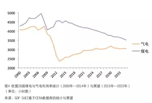 (3)2005 年—2015 年10 年間,歐盟的電力消費保持穩(wěn)中有降的飽和趨勢,2015 年相比2005 年下降1%。2015 年,非水可再生能源消費比重接近20%( 見圖3), 其中風電接近10%。丹麥、西班牙、葡萄牙以及德國等的非水可再生比重更是達到30%以上,而同期電力消費明顯下降。由于電力批發(fā)市場價格持續(xù)下跌,碳市場價格不振,邊際成本較高的天然氣發(fā)電2009 年—2015 年幾乎被徹底擠出市場(見圖4),利用率大幅下降。在2016 年,由于廉價的天然氣(部分月份低過煤炭邊際成本)可得,這一趨勢反轉(zhuǎn),天然氣發(fā)電迅速反彈。