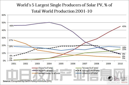 圖2 各國太陽能電池生產(chǎn)份額的變化