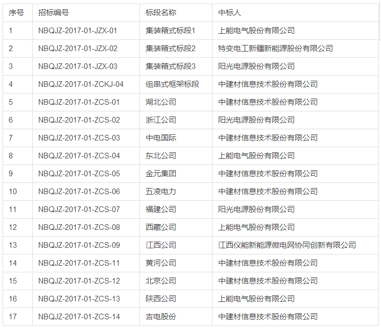 中國儲(chǔ)能網(wǎng)訊:3月21日,國家電力投資集團(tuán)公司公布了其二〇一七年度第十批集中招標(biāo)(第一批光伏并網(wǎng)逆變器、組件設(shè)備)招標(biāo)結(jié)果公示。結(jié)果顯示,億晶光電、天合光能、樂葉光伏、特變電工、陽光電源、上能電氣、中節(jié)能太陽能、 中電科電子、 光為綠色能源、中建材信息技術(shù)、江西儀能新能源等11家企業(yè)成功中標(biāo),成為2017年光伏行業(yè)首批設(shè)備供應(yīng)商。