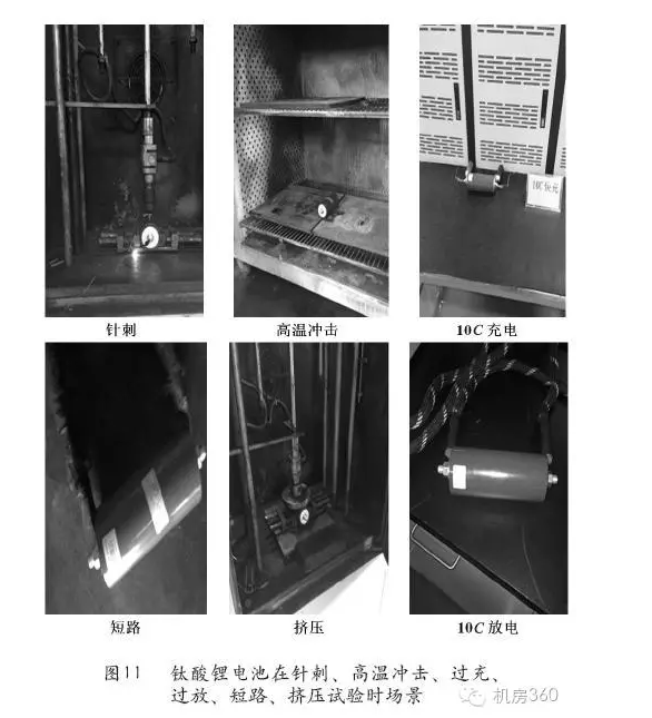 ②使用安全。鈦酸鋰電池在短路、過充、過放、擠壓、針刺、跌落、高溫沖擊、加熱的條件下是非常安全的,圖11是鈦酸鋰電池在針刺、高溫沖擊、過充、過放、短路、擠壓試驗時的場景;