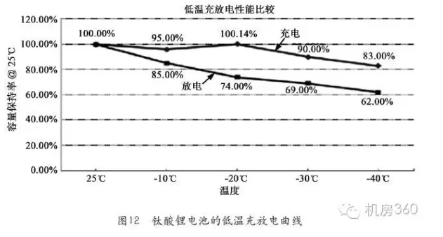 ④耐高溫性能優(yōu)越,鈦酸鋰電池在-40~+60℃溫度下仍然能夠正常工作,圖12給出了鈦酸鋰電池的低溫充放電曲線;