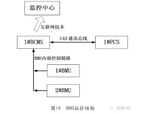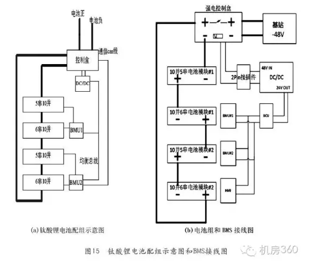 例如,某通信基站使用48V/300Ah鈦酸鋰電池(實物圖見圖14),每組電池由22只300Ah的電池模塊串聯(lián)組成,其中300Ah的電池是由10個單電芯容量為30Ah的電芯并聯(lián)組成,22節(jié)300Ah的電池模塊分別有2個6串和2個5串模組串聯(lián)組成一個48V/300AH的電池組,整組電池由BMS系統(tǒng)控制,由一個BCMS(BatteryClusterManagementSystem,主控電池管理系統(tǒng))負責管理一個電池組中的全部BMU(BatteryManagementUnit,電池組管理單元),同時具備電池組的電流采集,總電壓采集,漏電檢測功能,并在電池組狀態(tài)發(fā)生異常時驅(qū)動斷開高壓功率接觸器,使電池組退出運行,保障電池使用安全。兩個BMU,每個BMU負責管理12串單體電池模塊。具有電池電壓采集,多點溫度采集,各種保護和電池組均衡控制等功能。鈦酸鋰電池配組示意圖和BMS接線如圖15所示。