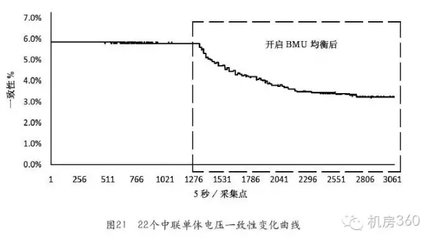 從圖21可以看出300Ah電池組22模組在開啟BMU均衡的時候,電壓一致性從分散的狀態(tài)逐漸趨于集中,表明單體均衡功能有效。