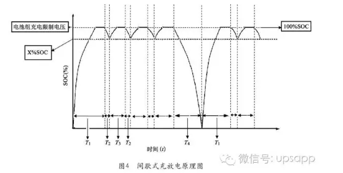 由于鈦酸鋰電池的電解液是有機(jī)液體,再加上鋰金屬是一種非?;顫姷脑?所以該電池必須密封,電池在正常的充放電條件下是幾乎不產(chǎn)生氣體的。即使電池長(zhǎng)期處于間歇充電狀態(tài)下,電池內(nèi)部也不會(huì)產(chǎn)生較高壓力,電池安全可靠。另外,通信基站電源對(duì)電池組的供電方式是浮充加均充穩(wěn)壓限流工作模式,對(duì)于電池組間歇充電而言,調(diào)整浮充和均充電壓,都設(shè)定為53.9V,對(duì)鈦酸鋰電池組進(jìn)行充電,這個(gè)電壓對(duì)電池極板和電解液都是比較穩(wěn)定的,電池容量變化極小,不同的浮充電壓值對(duì)電池的容量影響不明顯,電池可以長(zhǎng)期處于間歇式充、放電狀態(tài),所以鈦酸鋰電池組用于通信基站是非常適合的。圖4為間歇式充放電原理圖。