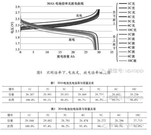 圖8是30Ah電池在不同倍率下的充、放電倍率曲線圖。具體數(shù)據(jù)見(jiàn)表1和表2。