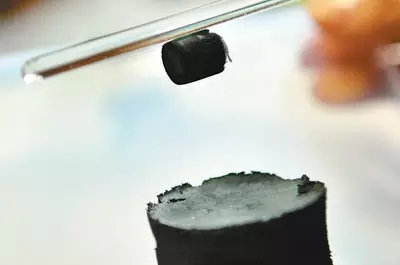 浙江大學(xué)利用石墨烯制成的“碳海綿”很輕,很容易被玻璃棒上的靜電吸附。龍 巍攝