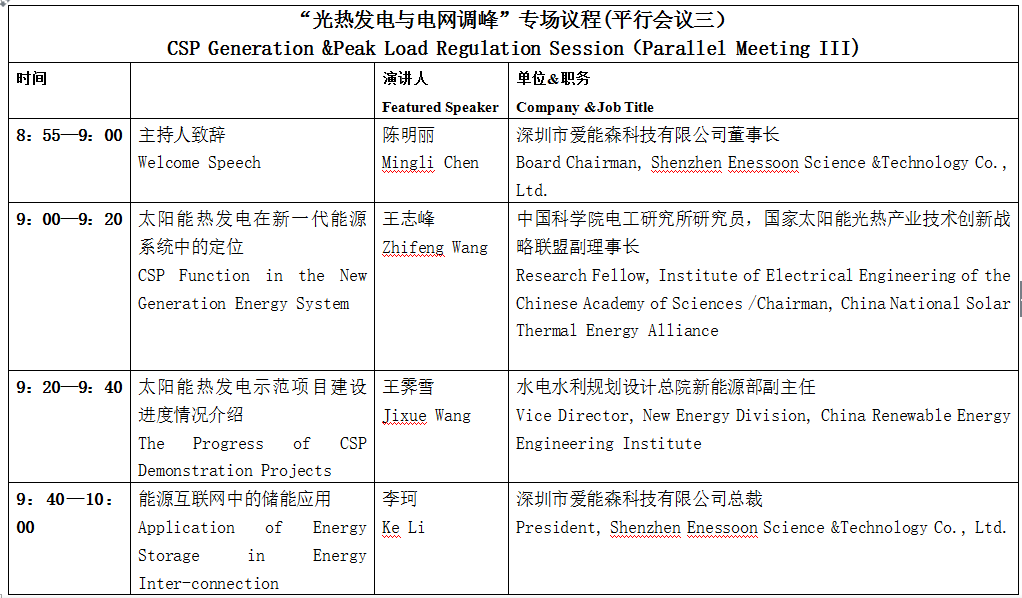 以下為光熱發(fā)電與電網(wǎng)調(diào)峰專場(chǎng)具體議程安排。