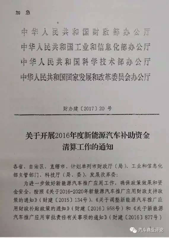 今日,一份寫有“加急”字樣的文件流出。這就是財(cái)政部、工信部、科技部、發(fā)改委等四部委3月20日聯(lián)合會(huì)簽的《關(guān)于開展2016年度新能源汽車補(bǔ)貼資金清算工作的通知》(以下簡(jiǎn)稱“加急文件”)。