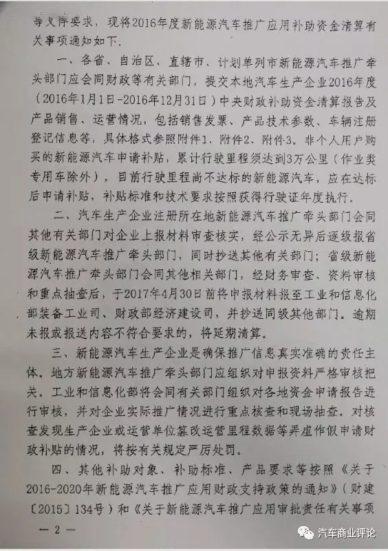 2016年12月29日發(fā)布的《關(guān)于調(diào)整新能源汽車推廣應(yīng)用財(cái)政補(bǔ)貼政策的通知》,對(duì)補(bǔ)貼資金撥付方式進(jìn)行了改動(dòng):由之前的先預(yù)撥再清算改為先清算再撥付。