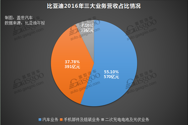 比亞迪業(yè)務(wù)板塊包括新能源汽車和傳統(tǒng)燃油汽車在內(nèi)的汽車業(yè)務(wù)、手機部件及組裝業(yè)務(wù),以及二次充電電池及光伏業(yè)務(wù),其中汽車業(yè)務(wù)營收約570億元,同比上升40.23%,占到集團總收入的55.1% 。其中新能源汽車業(yè)務(wù)整體收入約人民幣346.2億元,同比增長80.27%,占比亞迪集團總收入的比例增至 33.46%,成為集團收入和利潤的重要來源。
