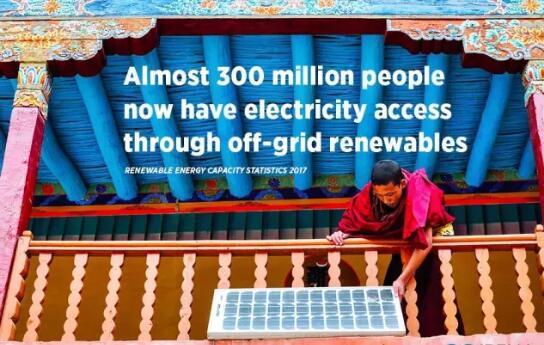 今年也是IRENA第一次將離網(wǎng)可再生能源相關(guān)數(shù)據(jù)納入此報(bào)告。截至2016年底,離網(wǎng)型可再生能源發(fā)電容量達(dá)到了2800MW。其中約40%來(lái)自太陽(yáng)能,10%來(lái)自水能。其余最大比例則來(lái)自生物質(zhì)能。據(jù)估算,全球有多達(dá)六千萬(wàn)戶家庭(或3億人口)由此獲益。