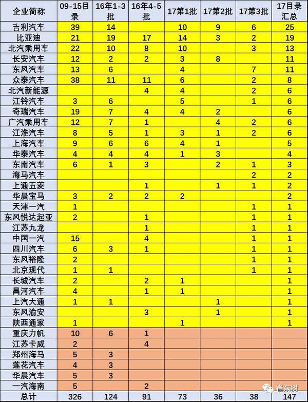 《新能源汽車推廣應(yīng)用推薦車型目錄》(2017年第1批),共包括39戶企業(yè)的185個車型,其中純電動產(chǎn)品共35戶企業(yè)124個型號、插電式混合動力產(chǎn)品共12戶企業(yè)60個型號、燃料電池產(chǎn)品共1戶企業(yè)1個型號。《新能源汽車推廣應(yīng)用推薦車型目錄》(2017年第2批)共包括40戶企業(yè)的201個車型,其中純電動產(chǎn)品共40戶企業(yè)157個型號、插電式混合動力產(chǎn)品共8戶企業(yè)44個型號。第三批共包括87戶企業(yè)的634個車型。其中純電動產(chǎn)品共85戶企業(yè)505個型號、插電式混合動力產(chǎn)品共21戶企業(yè)128個型號、燃料電池產(chǎn)品共1戶企業(yè)1個型號。。