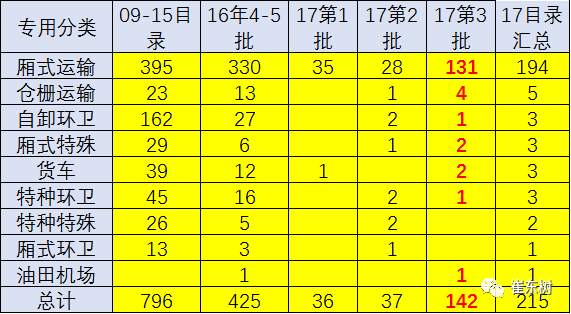 目前尚未進(jìn)入17年目錄的是江蘇澳新、中聯(lián)重科、北京華林、天津清源、國宏汽車等前期主力專用車企業(yè)。