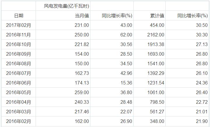 以下為2016年2月至2017年2月我國風電發(fā)電量統(tǒng)計: