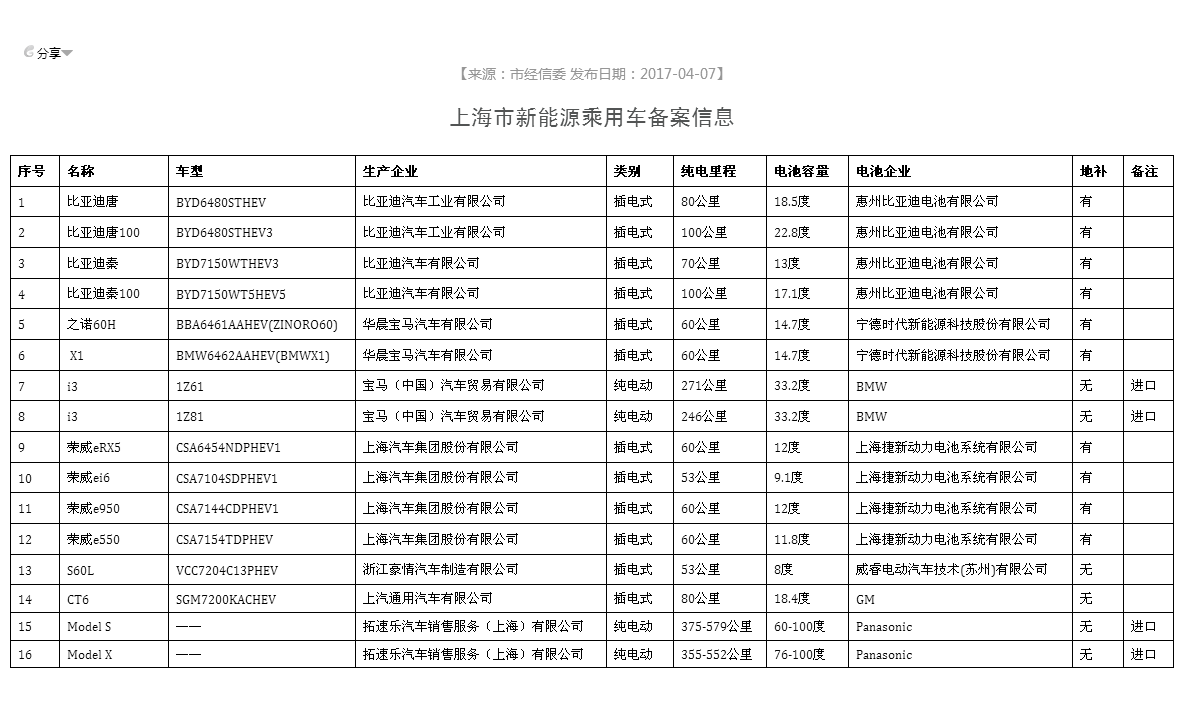 中國儲能網(wǎng)訊:4月7日,上海市經(jīng)濟和信息化委員會發(fā)布了2017年3月上海市新能源汽車備案信息,共有16款車型進入備案,包括12款插電式車型與4款純電動車。