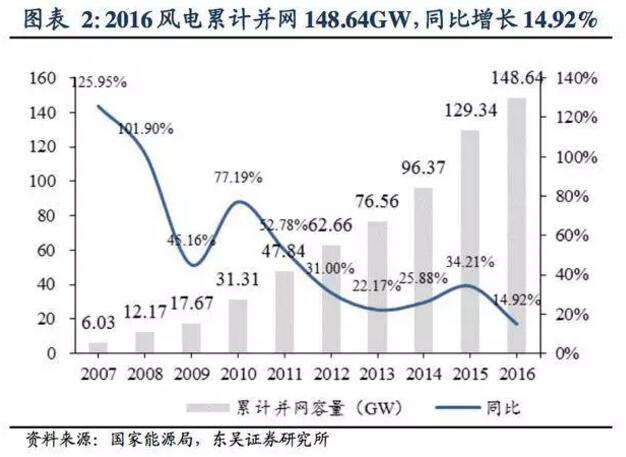 新增并網(wǎng)裝機19.30GW,同比下降 41.46%:2017年1月26日,國 家能源局發(fā)布2016年風電并網(wǎng)運行情況。2016年全年新增風電裝機19.30GW,同比下降41.46%;累計并網(wǎng)裝機達到148.64GW,同比增長14.92%。2016 年是我國風電開發(fā)往東部、南部轉(zhuǎn)移的突破之年,風電布局進一步優(yōu)化。受南方施工條件復雜以及夏季雨季、汛期的影響,施工周期拉長,并網(wǎng)進度延緩。
