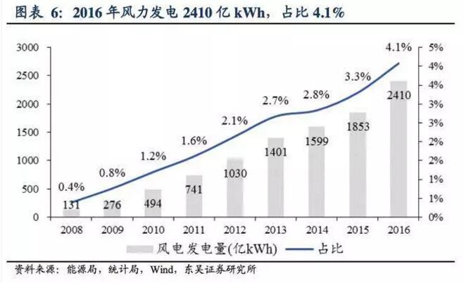 發(fā)電量占比4.1%,上升0.8個百分點:發(fā)電量方面,2016年全國風 電發(fā)電量 2410 億千瓦時,占全部發(fā)電量的4.1%同比上升了0.8個百分點,份額進一步提升。