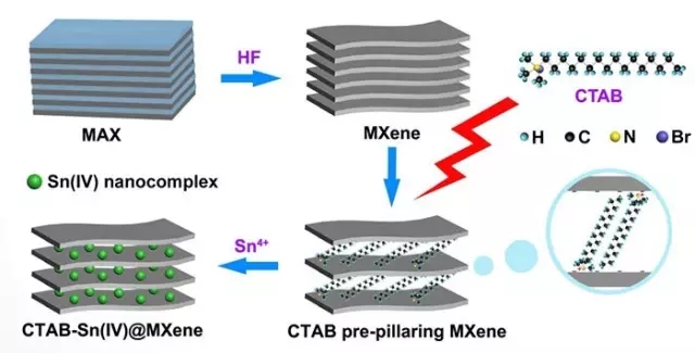 中國(guó)儲(chǔ)能網(wǎng)訊:二維MXene是一類二維過(guò)渡金屬碳/氮化物晶體材料。作為新型二維材料,現(xiàn)已經(jīng)廣泛應(yīng)用于超級(jí)電容器、鋰離子電池、儲(chǔ)氫、污水凈化、光催化等領(lǐng)域。雖然MXene材料在電化學(xué)儲(chǔ)能領(lǐng)域具有良好性能,但是其層間儲(chǔ)能空間尚未完全開(kāi)發(fā)利用。那么,有沒(méi)有可能使用一些新方法,使MXene的層間域進(jìn)一步增大,且達(dá)到可控,從而進(jìn)一步有效利用其儲(chǔ)能空間?近日,浙江工業(yè)大學(xué)陶新永教授團(tuán)隊(duì)利用陽(yáng)離子表面活性劑、金屬錫離子等對(duì)MXene進(jìn)行預(yù)柱撐和柱撐處理,制備了一種新型高性能的“柱撐結(jié)構(gòu)”MXene材料,并成功用于鋰離子電容器。