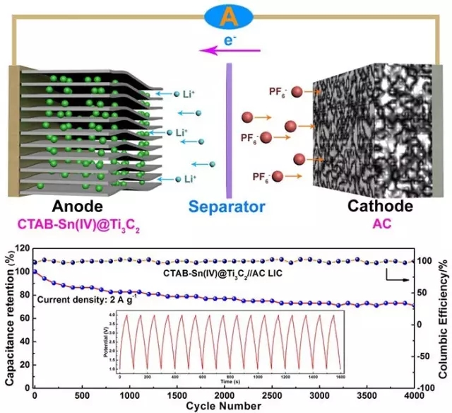 鋰離子電容器是介于鋰離子電池與超級(jí)電容器之間的一種電化學(xué)儲(chǔ)能器件,同時(shí)兼具超級(jí)電容器的高功率密度以及鋰離子電池高能量密度等特點(diǎn)。目前鋰離子電容器負(fù)極材料主要是一些嵌入型材料(如TiO2-B、Li4TiO12等)。然而,嵌入型負(fù)極材料因其較低的容量以及較差的倍率性能已不能滿足高能量密度、高功率密度鋰離子電容器的需求。二維MXene材料因其高電導(dǎo)率、低鋰離子擴(kuò)散能壘等優(yōu)點(diǎn),在鋰離子電容器中展現(xiàn)出良好的應(yīng)用前景,但受制于層間域有限,其儲(chǔ)鋰容量尚需改善。