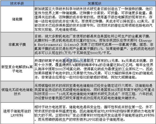 根據(jù)前瞻產(chǎn)業(yè)研究院《2017-2022年中國儲能行業(yè)市場前瞻與投資預(yù)測分析報告》統(tǒng)計數(shù)據(jù)顯示,材料的成本占到儲能電池的成本約在40%-50%。提升關(guān)鍵材料技術(shù),降低關(guān)鍵材料成本對于儲能產(chǎn)品成本的降低有著重要意義。目前相關(guān)的技術(shù)提升形式主要有以下幾種: