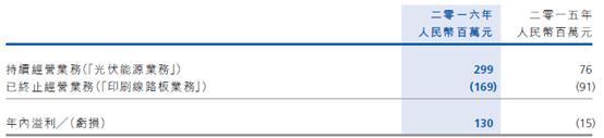 協(xié)鑫新能源(0451.HK)于2014年5月9日完成重組交易,在香港主板借殼上市。2016年12月30日,協(xié)鑫新能源發(fā)布公告稱,公司將集中資源發(fā)展光伏能源業(yè)務,不再從事印刷線路板業(yè)務。故出售印刷線路板業(yè)務的全部股權,代價為2.5億港元。在發(fā)布的最新財報中,原印刷線路板業(yè)務經營業(yè)績被劃分為已終止經營業(yè)務。下表截圖為2015-2016年協(xié)鑫新能源主營業(yè)務構成: