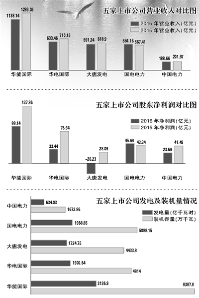 比照2016年與2015年的經(jīng)營業(yè)績,五大發(fā)電旗下主要上市公司基本延續(xù)了2015年營業(yè)收入下降的趨勢,但盈利情況卻出現(xiàn)了極具戲劇性的“反轉(zhuǎn)”:上一報告期唯一一個出現(xiàn)凈利潤下滑的國電電力,在2016年獲得了營業(yè)收入和歸屬股東凈利潤的雙提升;其他四家則正好相反,凈利潤降幅超過三成甚至腰斬,上期凈利的增長根本無法覆蓋2016年的下跌,以至2016年的凈利水平低于2014年。2015年凈利漲幅最高的大唐發(fā)電,2016年則虧損約26.23億元。